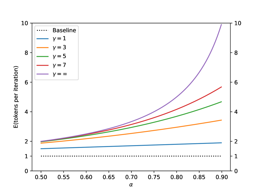 根据不同的 γ 值,Speculative Decoding 预期的 token 数量与 α 的函数关系如上图。这给出了一个简单的推论,接受率总是越高越好。